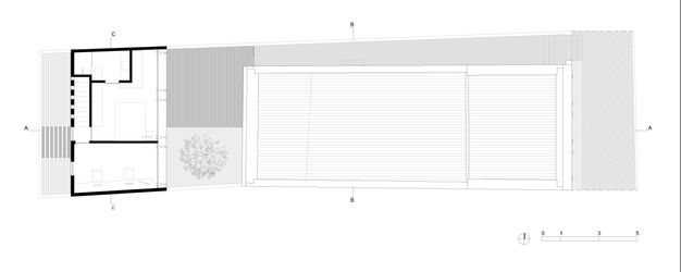 A proposta para residência do proprietário é construir uma nova edificação ao fundo do lote, com uma clareza na distinção entre o antigo e o novo edifício, através da escolha dos materiais e das técnicas construtivas. E para atender a novos padrões de uso do espaço e suprir todo o programa de necessidades, foi necessária a construção de um primeiro pavimento.